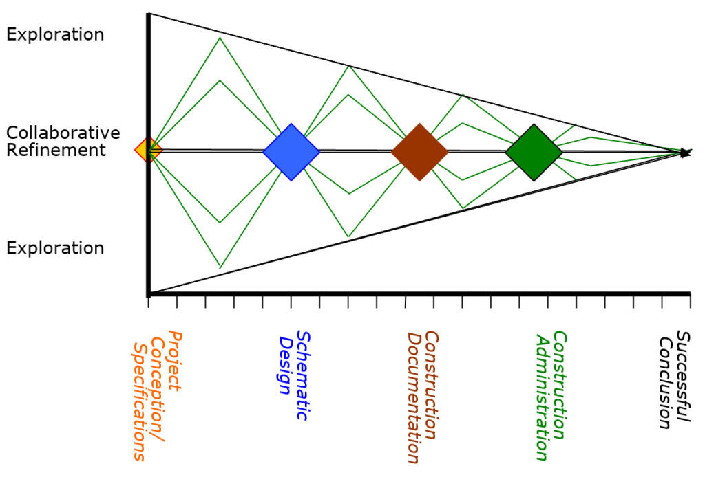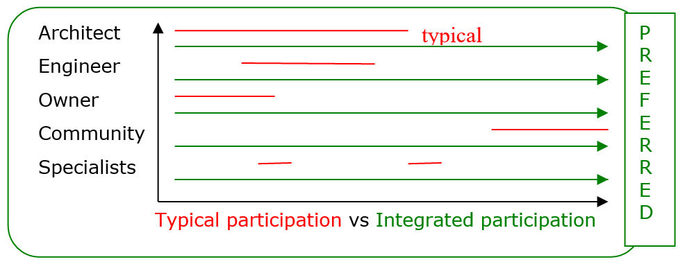 The conventional process engages design and construction professionals on a need-to-know basis, which is not good science. The Integrated Design Process (IDP) works to identify and engage stakeholders early and throughout, in order to establish and work correctly toward project goals in unison on a holistic basis.